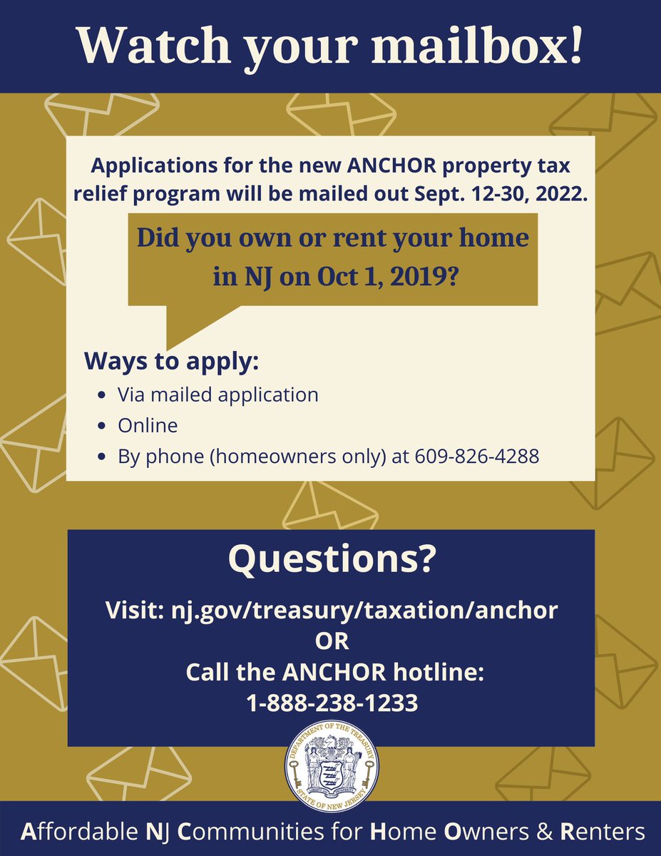 We have begun mailing 2021 Senior Freeze Property Tax Reimbursement checks to applicants who filed before May 1 2022. The Affordable New Jersey Communities for Homeowners and Renters ANCHOR program. Applications for the homeowner benefit are not available on this site for printing.